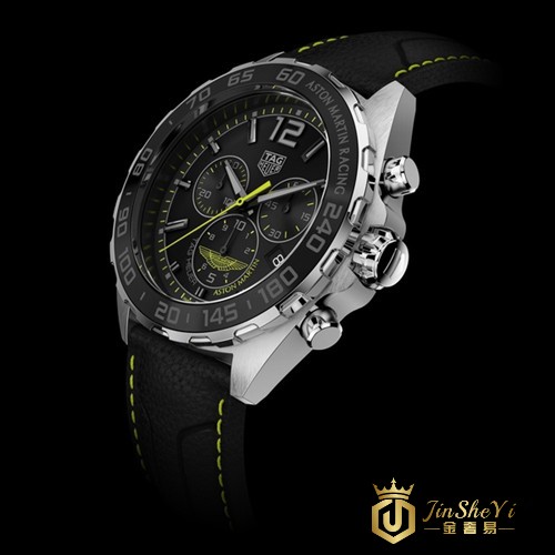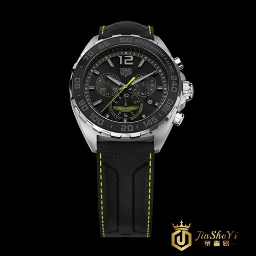 泰格豪雅 Formula 1系列 Aston Martin腕表是一款石英计时码表,以精钢打造而成,直径43毫米,采用带凹口设计的精钢表圈,配铝垫圈,表圈上带速度计刻度。时标、秒针以及阿斯顿·马丁著名的双翼标志均采用阿斯顿·马丁车队代表的绿黄色,与黑色表盘形成鲜明的视觉对比。这款腕表的机芯精度高达1/10秒,显示在6点钟位置的小计时盘上,这是赛车腕表不可或缺的特征;9点钟位置设有分钟计时盘,3点钟位置设有当前秒钟计时盘。这是专为阿斯顿·马丁打造的独一无二的名表,因为这是泰格豪雅第一次为Formula 1系列搭配皮表带,采用绿黄色缝线的黑色皮表带,令腕表个性独具,散发浓郁的运动气息。