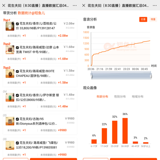 截止到4月22日,花生夫妇一共开了两场(二手)奢侈品直播,第一场奢侈品直播(4月18日)售出35单,单场销售额达27万,平均客单价约7700元;第二场奢侈品直播(4月19日)售出68单,单场销售额破55万,平均客单价超过8000元。