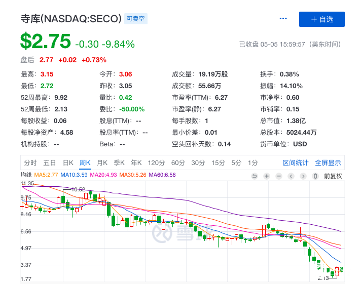 和以烧钱换规模的电商同行比起来,寺库一直保持着盈利状态,但其在资本市场的表现不尽人意。2017年在纳斯达克上市后,寺库股价不断下滑,如今浮动于3美元上下,相比13美元的发行价已跌去逾75%。
