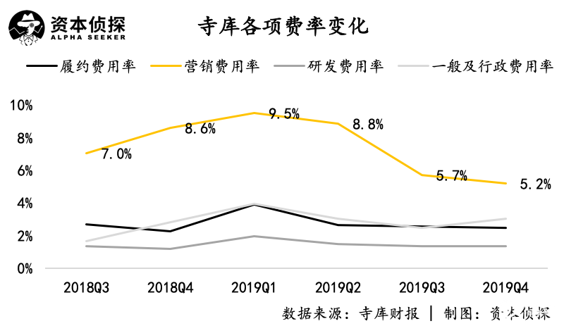 在各项费用中,寺库对营销费用的控制尤为明显。当其他各项费率基本保持稳定时,寺库的营销费用率从此前的9%左右降到了本季度的5.2%。