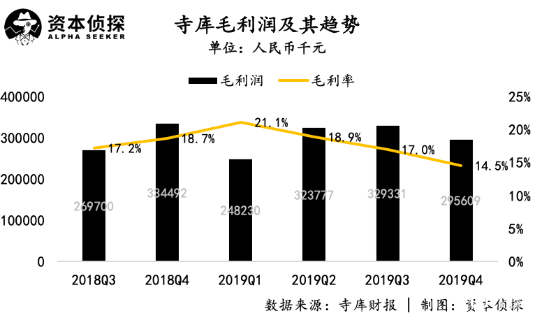 2019年第四季度,寺库的毛利润为2.96亿元,同比下跌11.6%;毛利率为14.5%,上年同期和上一季度分别为18.7%和17%,毛利率呈现持续下滑趋势。