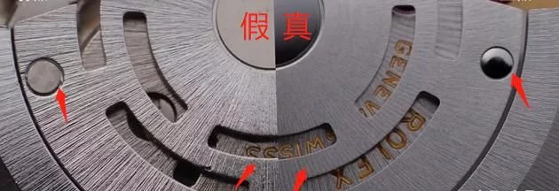 仿品机芯字母偏黑灰,螺钉契合度不高,缝隙很宽。