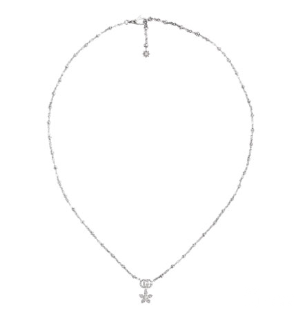 这款18k白金吊坠项链将小巧的钻石花朵吊坠与双 G结合在一起,融合了新旧代码。不断激发Gucci叙事对自然世界的迷恋,这朵花也以迷人的韵味反复出现,丰富了瓶口,链长38厘米,可调至42厘米,时尚优雅。古驰(Gucci)一款白金钻石手链,双 G灵感源自70年代(豪宅时代的标志性时代)的档案设计,其纤巧的白金袖口手镯的两端均设有此标志。象征性的图案上缀有白色钻石。薄薄的设计使该款式可以与其他手链一起佩戴。