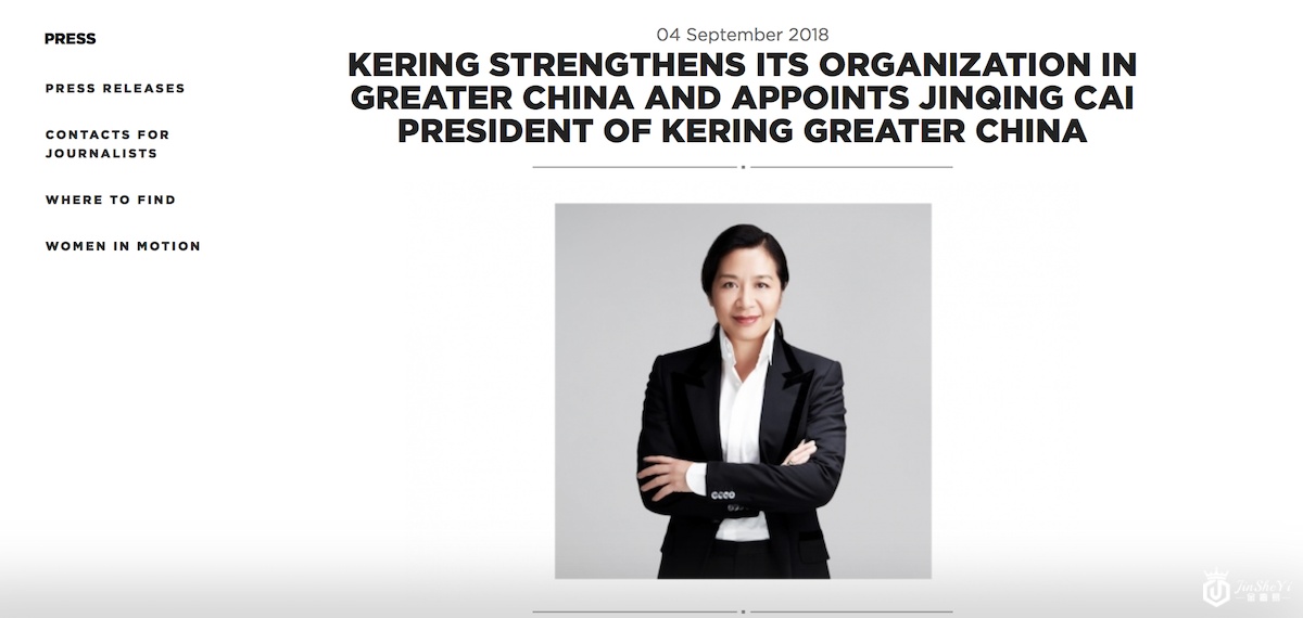 近日,法国奢侈品巨头Kering(开云集团)宣布任命蔡金青女士担任集团大中华区总裁,加强大中华区团队建设,以适应快速变化的商业环境。