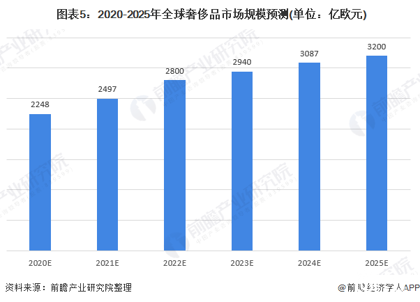 贝恩预计,全球奢侈品市场将在2022年或2023年恢复至2019年水平。届时,市场也将逐步恢复增长动力,到2025年,市场规模有望达到3200至3300亿欧元。