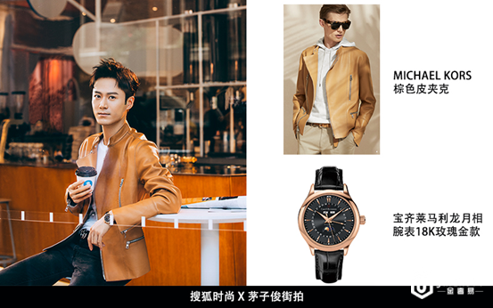 在拍摄中茅子俊选择宝齐莱马利龙月相腕表18k玫瑰金款,整体黑色的腕表凸显出茅子俊深邃,稳重的酷,玫瑰金表盘又与身着的棕色皮夹克相呼应,彰显出只属于茅子俊的特色!坚定、努力、从不随波逐流!