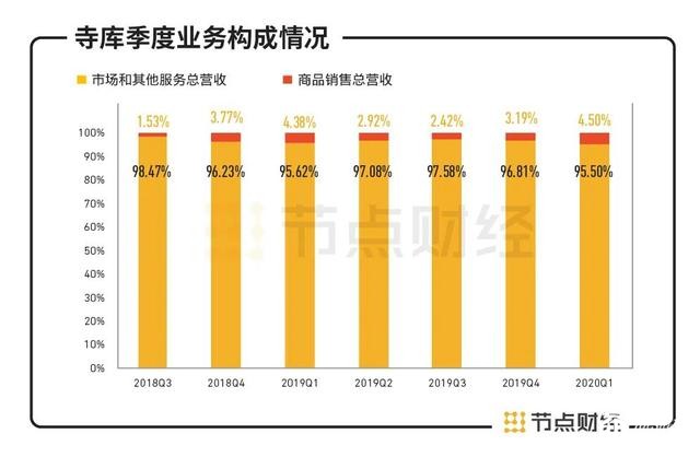从目前寺库的财务表现来看,上述业务尝试还未为其开拓新的增长引擎。公司虽然也发展金融、智能、社群等业务,但目前在收入上尚未有太多体现,公司“奢侈品垂直电商”的标签依然明显:财报显示,目前寺库营收的主要来源是商品销售收入和平台及其他服务收入。商品销售即奢侈品售卖,该项业务收入在营收中的占比依然超过95%。