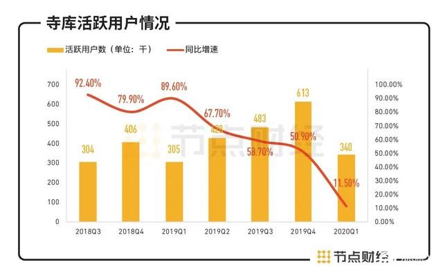 受2020年年初新冠肺炎疫情影响,用户公众活动和可自由支配支出减少、奢侈品消费行业受到冲击等,寺库季度活跃客户群增长减缓。2020年Q1,其活跃用户为34万,同比增长11.5%。这一增速是过去两年的最低水平。
