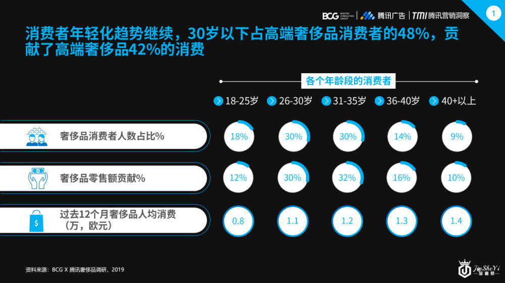 而在2019年6月BCG与腾讯广告打造的《2019中国奢侈品市场消费者数字行为洞察》报告中,年轻群体的消费力被再度证明:中国占据全球奢侈品市场1/3,其中30岁以下人群承揽了高端奢侈品42%的消费。这也就意味着,90后至00后年轻人的奢侈品消费行为令人瞩目。