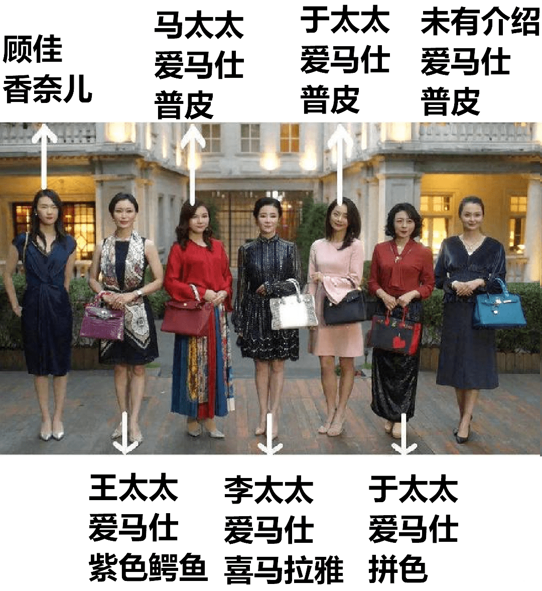 另外六个太太背的全是爱马仕,其中最中间 C 位阔太拎着价值260万的白色爱马仕喜马拉雅鳄鱼皮包。甚至因为顾佳没有爱马仕,还被太太们觉得不配出现在合影中,最后在朋友圈晒图环节被裁掉了。