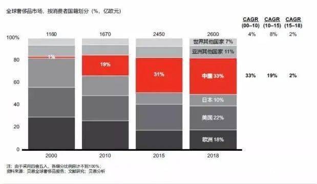 根据贝恩资讯数据显示,中国已经成为奢侈品消费大国。2000年,国人的奢侈品消费仅在全球市场占1%份额,然而,截止2018年这个比例攀升至33%,还有进一步攀高的趋势。