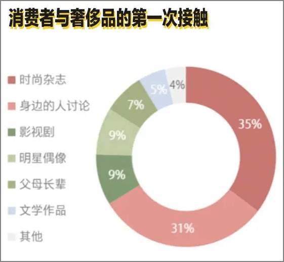 根据虎嗅网对中国人了解奢侈品的渠道调查,80后用户们主要是通过时尚杂志接触到奢侈品概念的。而90后、00后群体中,通过身边人和影视明星了解奢侈品的现象成为主流。