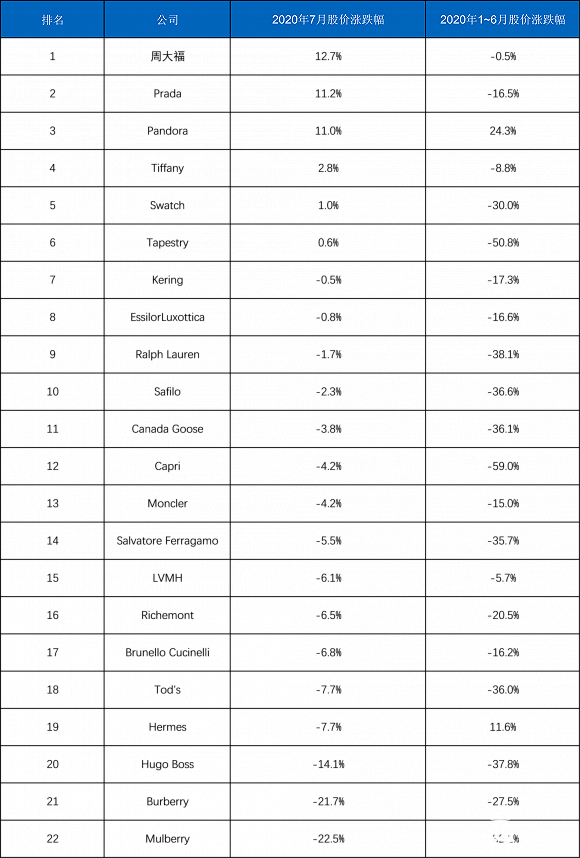 2020年7月跌幅最大的七只奢侈品股票具体分析如下: