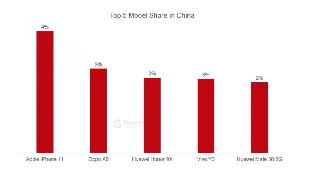 定价策略调整带来的效果很快显现,iPhone 11系列在中国和全球市场取得了不俗的销量表现。根据Counterpoint数据,iPhone 11是中国市场最新的畅销机型冠军。