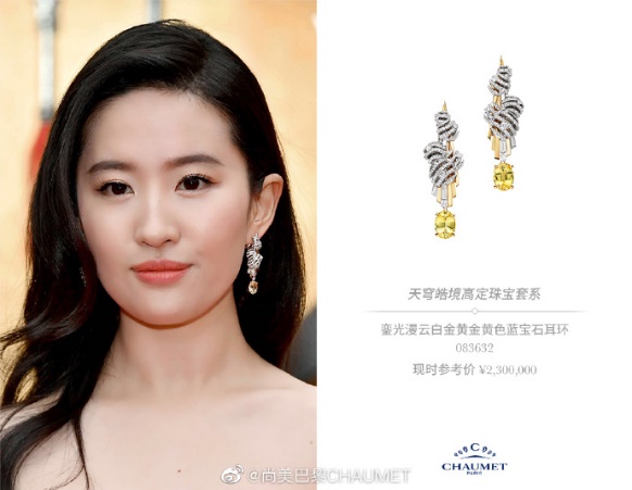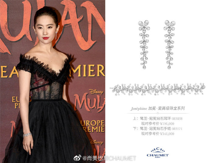 2020年3月,刘亦菲佩戴CHAUMET高定珠宝,分别亮相《花木兰》世界首映礼,及伦敦首映礼