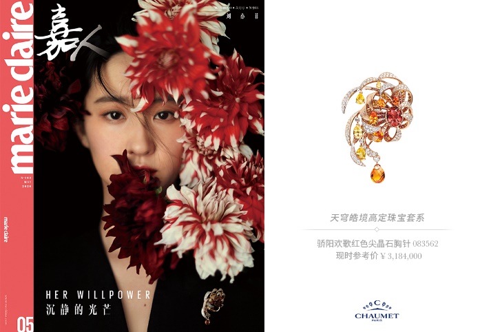 2020年5月,刘亦菲佩戴CHAUMET高定珠宝登上《嘉人》封面