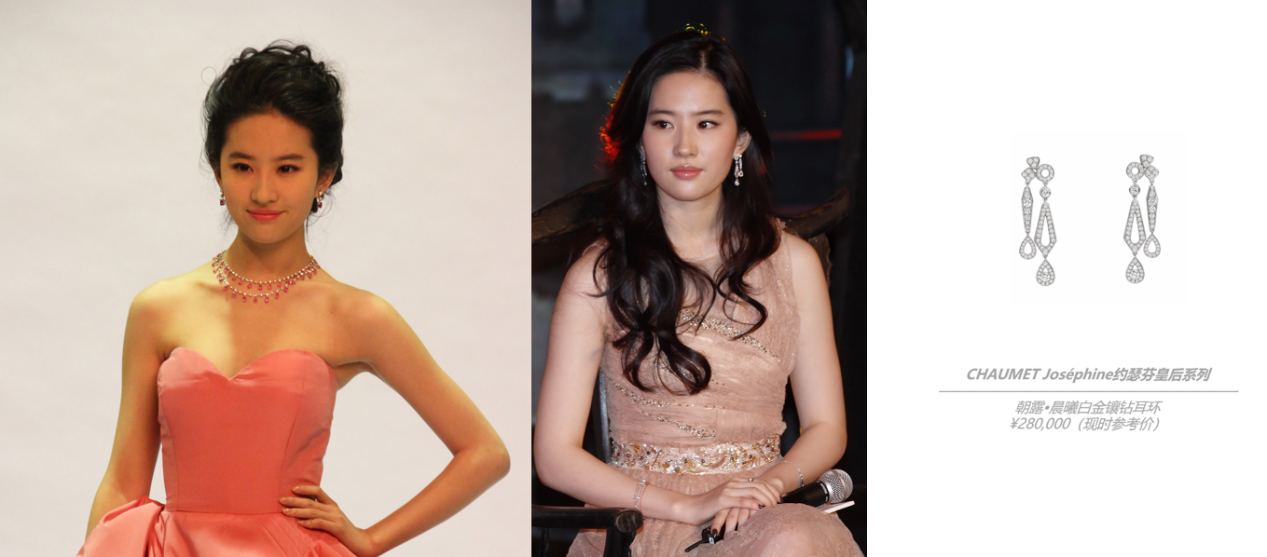 左图:2011年5月,刘亦菲佩戴CHAUMET珠宝作品,出席《时装男士》颁奖盛典,右图:2012年8月,刘亦菲佩戴CHAUMET珠宝作品,出席电影《铜雀台》发布会