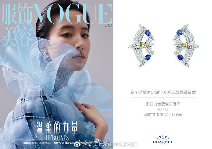 2020年4月,刘亦菲佩戴CHAUMET高定珠宝登上《VOGUE》封面
