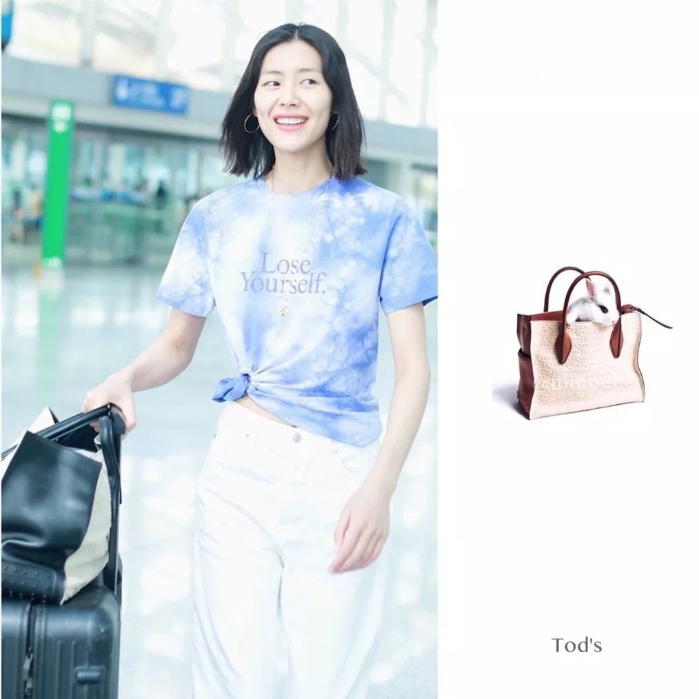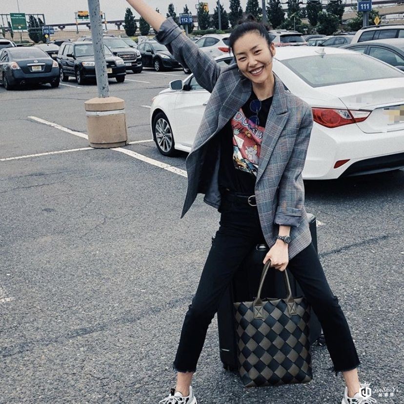刘雯的style一直都是简单休闲,夏天出行麻布材质的包包也是很合适的。
