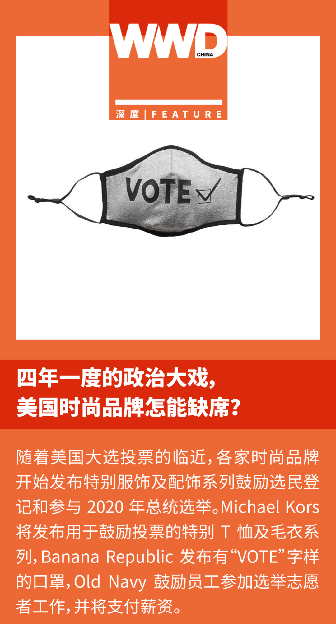 2020 年美国总统选举投票按计划将于 11 月 3 日举行,随着竞选期开始和投票日的接近,各家时尚品牌开始发布特别服饰及配饰系列鼓励选民登记和参与 2020 年总统选举。