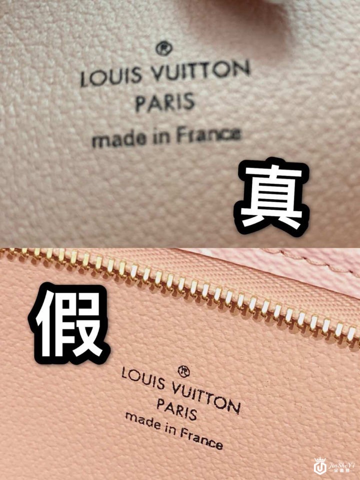 正品内侧烫印 目前都只有3行烫印,有的仿品则出现了4行,真是画蛇添足。另外,仿品“made in France”中的最后一个字母“e”,尾部竟然连了起来,正品一般不会出现这种印刷上的偏差。也因为LV的字体是经过特殊设计的,字“O”为同心正圆,字母“S”上小下大,字母“V”的底部是尖的,字母“N”的两头尖,且中间的横杠跨度大。