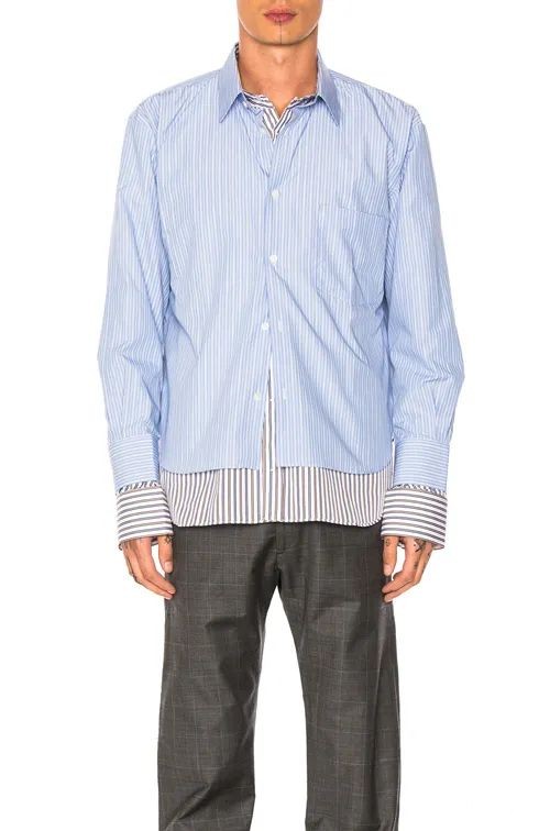 与Comme des Garçons联名的假两件衬衫同样选择了同样的条纹元素,整体观感和谐的同时又不乏跳跃感