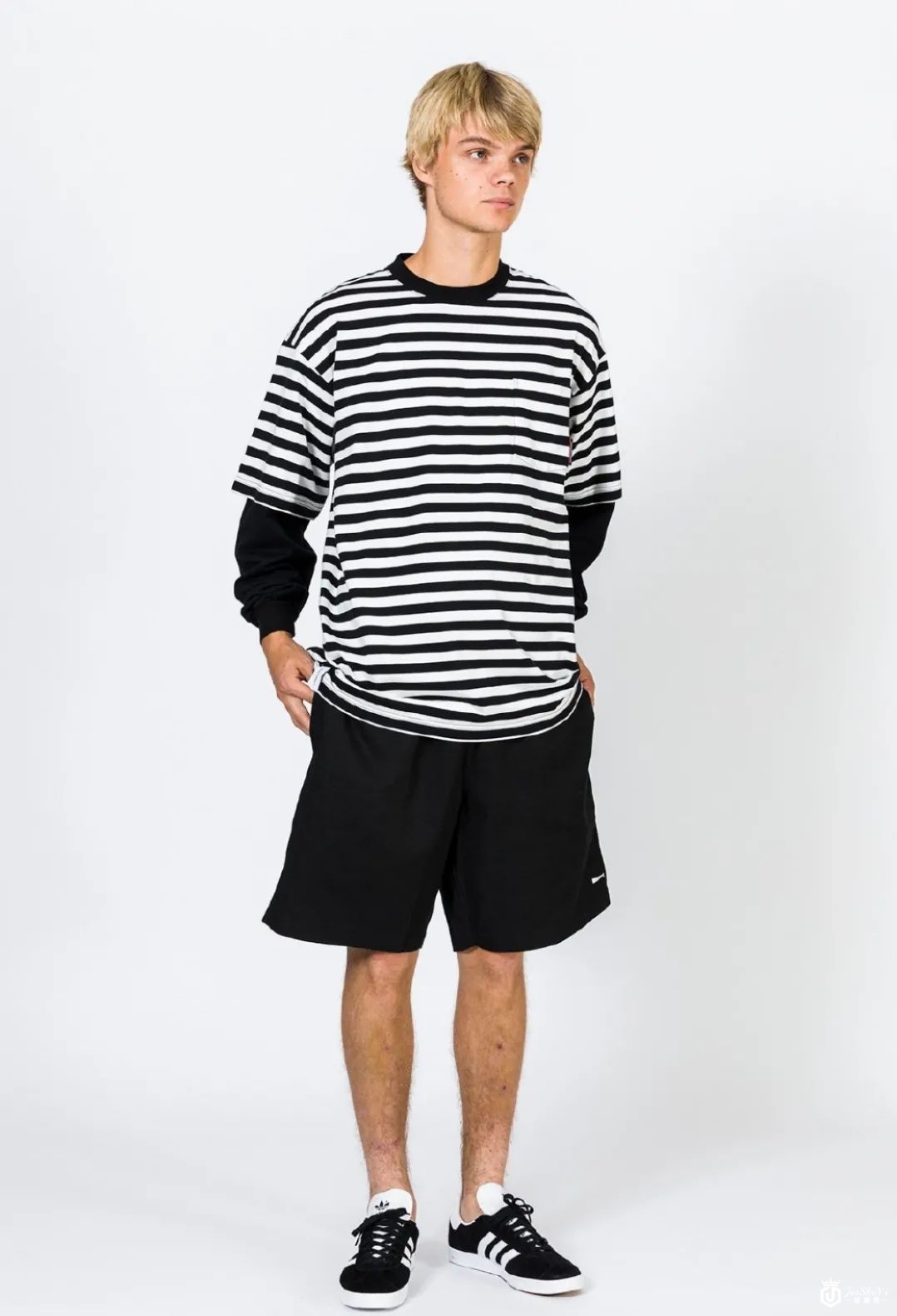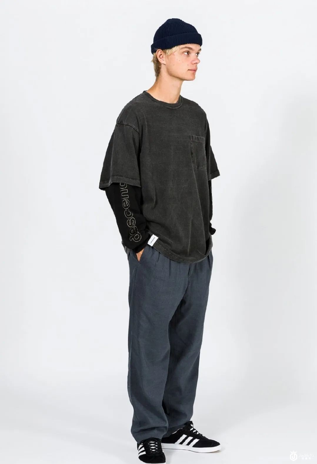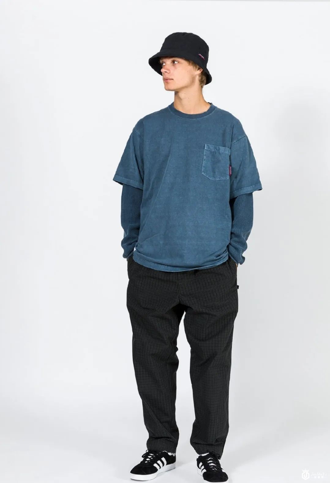 而DESCENDANT品牌休闲运动的假两件拼接搭配上更加亲民,无论是同色系叠穿,还是元素图案碰撞,只要同元素不同色或异元素同色,无论搭配宽松工装牛仔还是休闲短裤都能呈现舒适的日式审美。