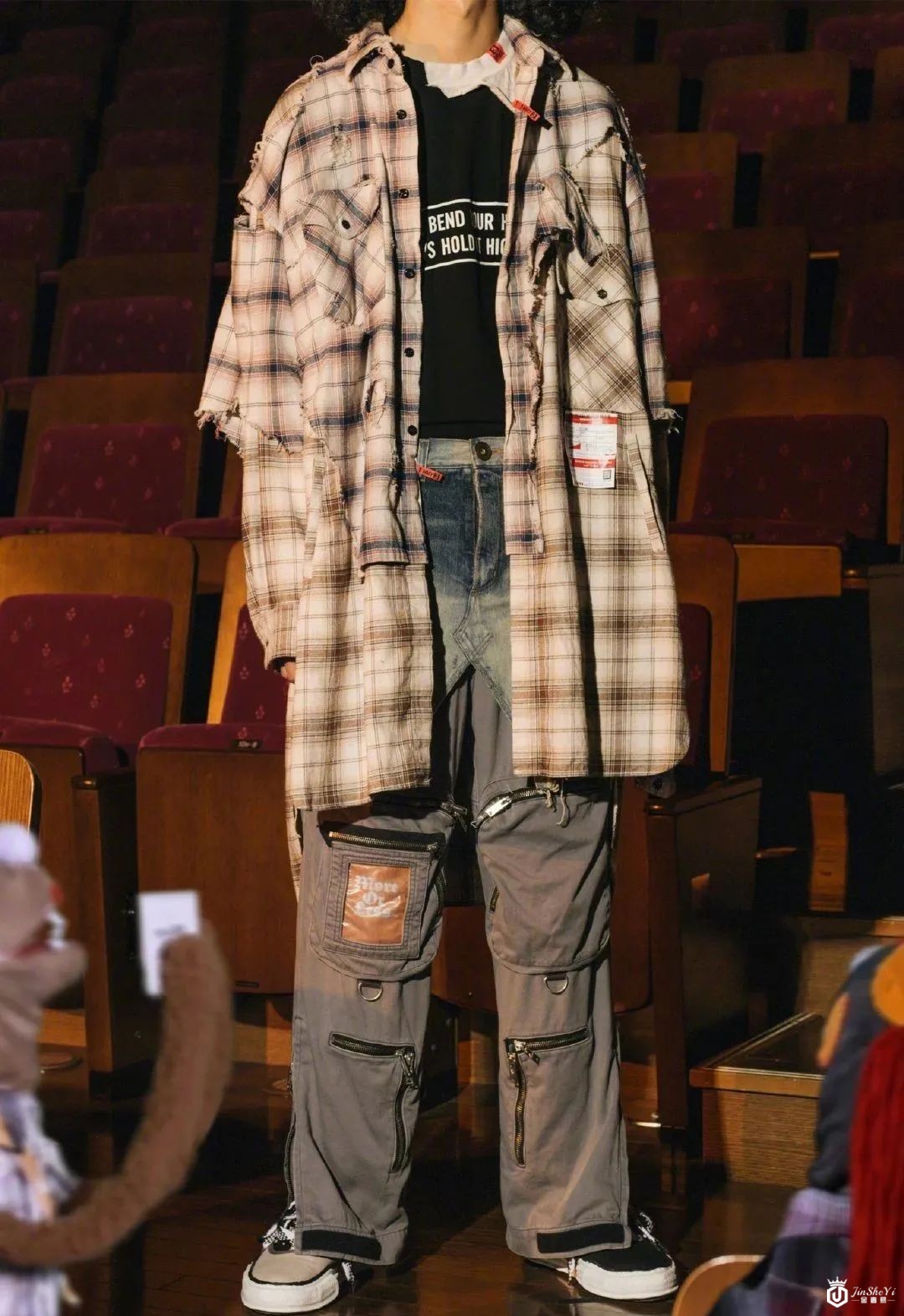 目前最爱假两件的吴亦凡上身AMBUSH格子衬衫与Tee拼接的摇滚风假两件