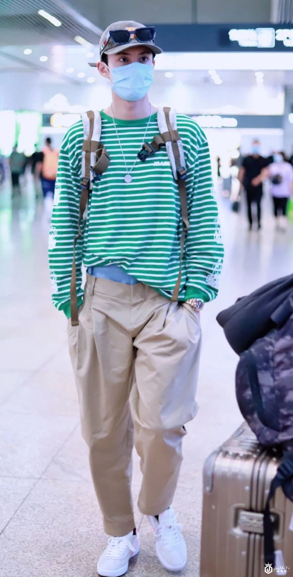王鹤棣穿着FENG CHEN WANG拼接假两件裤款机场造型,微微露出的裤头边有种不良少年的痞气