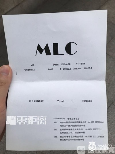 南京市民张女士2015年4月18日,她和朋友在金陵饭店办事,无意中看到一家专门卖奢侈品的“MLC品牌集合店”,就进去逛了逛。这个迪奥戴妃包当时放在中间的展台上,自己觉得很好看,就刷卡买了,26280元。