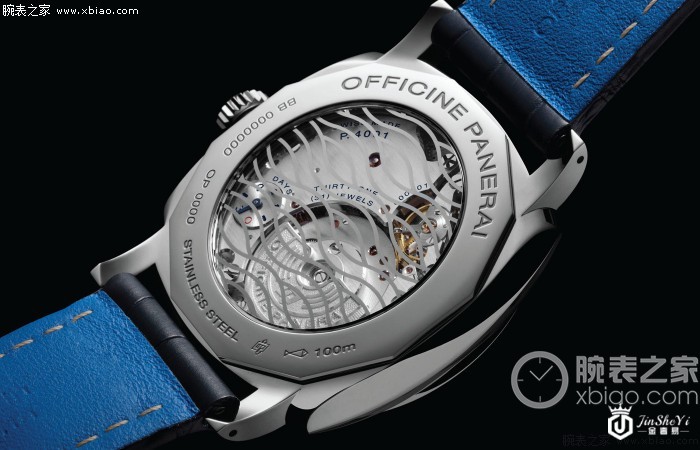 全新Radiomir 1940 3日动力储存腕表,提供五种款式,分为不同尺寸、材质和功能。Radiomir 1940枕形表壳稳健可靠,采用极简主义线性设计,由AISI 316L钢(直径42毫米、45毫米或47毫米)或优雅的红金(45毫米)打造,红金表壳与蓝色表盘形成完美的对比效果。透过蓝宝石水晶表背,可以看到腕表内置的机芯。表背以金属化工艺装饰波纹图案,让人联想到粼粼的海浪。