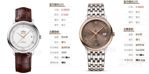 上图为欧米茄蝶飞精钢和蝶飞18k玫瑰金自动机械表官方媒体公价图