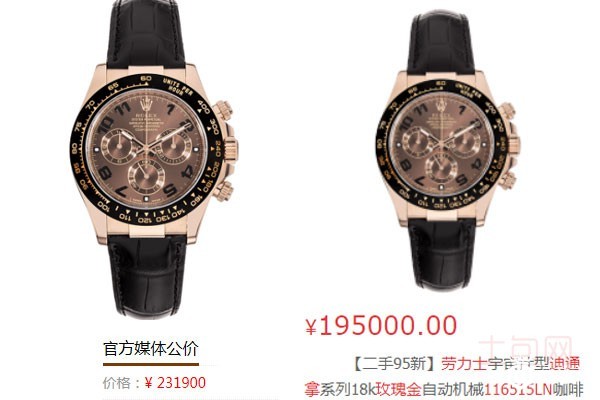 上图为劳力士迪通拿18k玫瑰金手表公价和二手95新的售卖价格对比