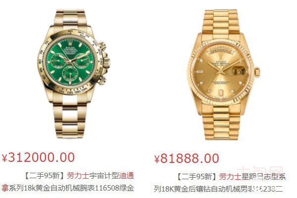 劳力士手表在二手回收平台可谓是占据鳌头,除了上面刚刚举例的那一款九五新的18k玫瑰金自动机械男士手表,还有比如像九五新的18k黄金绿盘手表,九五新的18k黄金后镶钻手表,这些在二手回收平台都会出现。因为首先作为劳力士这个大的手表品牌来说,本来就在回收市场有很大的行情,那么作为他旗下大热的迪通拿系列,自然也就不用多说了。