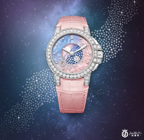 海上生明月,天涯共此时,一颗期盼团圆的心热烈而迫切。海瑞温斯顿海洋Ocean系列月相功能36毫米腕表,如明亮的皓月般照亮归家的路。海洋Ocean系列月相功能36毫米腕表不仅展现了经典的月相盈亏,更以两轮明月装饰——当左侧月亮在新月形显示窗中缓缓升起时,与之相对的右侧月亮则勾勒出它的月行轨迹。不仅如此,这款腕表还采用色彩渐变的艺术,将如梦似幻的苍穹与海洋幻化于天然的珍珠母贝表盘上,在月光下熠熠生辉。