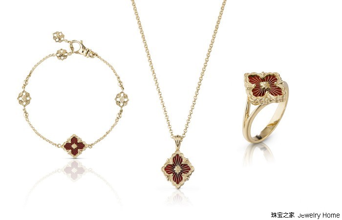 采用匠心独具的“珠罗纱”雕刻工艺,使珠宝散发出如蕾丝般的精致奢华。OperaTulle系列以黄金勾勒出布契拉提标志性的花卉图案,搭配热烈绚丽的红色珐琅,洋溢恒久炽热之爱,共赴向往已久的甜蜜邀约。