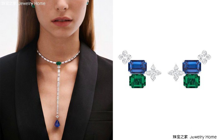 又如另一款Planètebleue蓝色星球项链,有人最先被祖母绿吸引,有人最先关注到Monogram花卉形钻石,也有人一眼相中那颗拥有水晶质感的梨形蓝宝石。同主题的耳环,更让人说不清谁是主角。