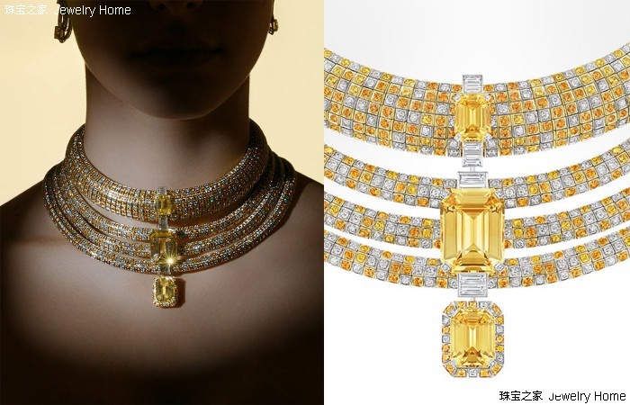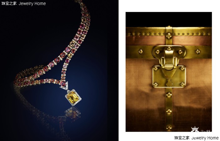 LeMagnétisme项链上镶嵌钻石的V字形,象征LV标识和旅行箱的金属护角。一颗重达重达20.29克拉的黄色蓝宝石位于项链的焦点位置,另有两排粉色、橙色和黄色碧玺,与旅行箱上的金属铆钉相呼应。