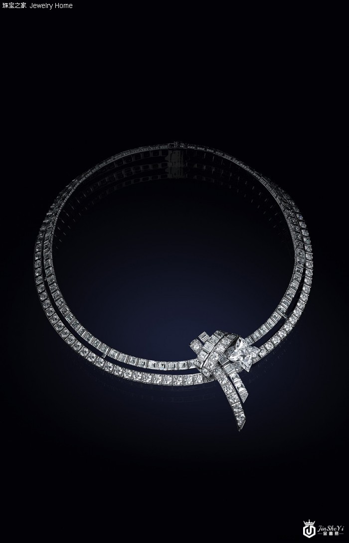 方形和圆形钻石组成的两排白金链条像是路易威登旅行箱内部的绳结。一枚LVMonogram星形切割钻石点缀在结扣旁,这颗重达10.07克拉的TypeIIa型钻石,颜色D色,净度IF(内部无暇),这些是钻石质量评级标准中的最高级别。