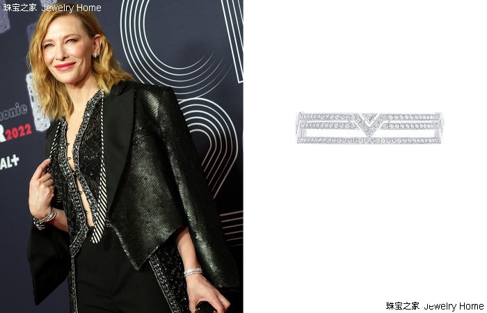 在今年法国电影凯撒奖颁奖典礼上,“大魔王”凯特·布兰切特在一套黑色路易威登“战袍”的陪伴下拿下荣誉奖,佩戴的珠宝同样来自路易威登高级珠宝系列。