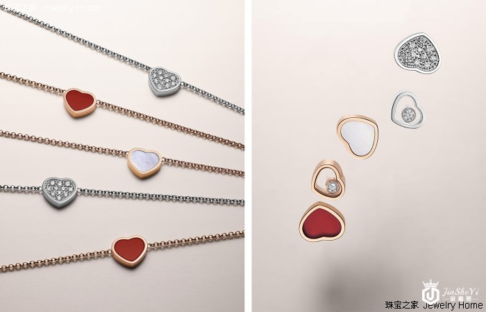 由符合萧邦可持续发展与社会责任理念的玫瑰色18K金与白金打造出精巧玲珑的心形,饱含热情的红玉髓、纯洁柔和的珍珠母贝与闪耀澄净的钻石镶嵌其上,交相映出灵动光辉,无论是单独佩戴还是组合叠戴,都将带来无限妙趣。