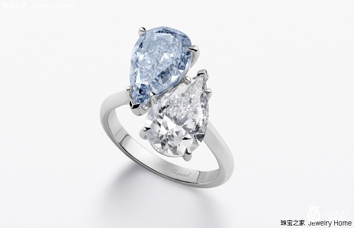 以大自然为灵感之源,卡罗琳·舍费尔(Caroline Scheufele)从世界各地精心搜寻了一系列珍贵宝石,其中不乏难得一见的臻品,包括一颗重3.01克拉的D色内部完全无瑕级IIA型梨形切割钻石和一颗重4.10克拉的VS2级浓彩蓝色梨形切割钻石(色彩如此绚丽的钻石鲜能达到这一克拉数)。萧邦工坊的珠宝工匠通过杰出技艺,将两枚钻石巧妙配搭,镶嵌于一枚雍容华贵的Toi et Moi戒指之上。两颗绝美宝石交相辉映,恰若天作之合。