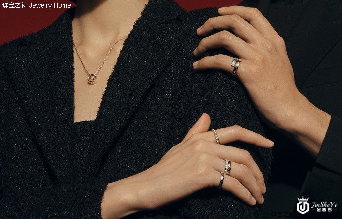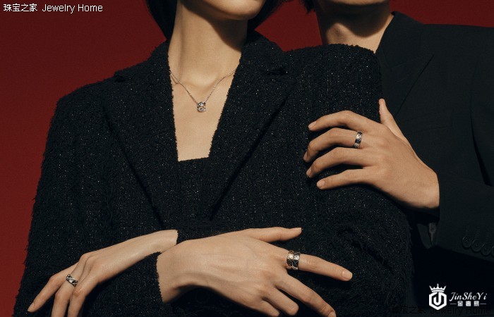 她佩戴COCOCRUSHBEIGE米色K金镶钻项链、精致款BEIGE米色K金镶钻戒指、白K金镶钻戒指与BEIGE米色K金戒指、白K金戒指。