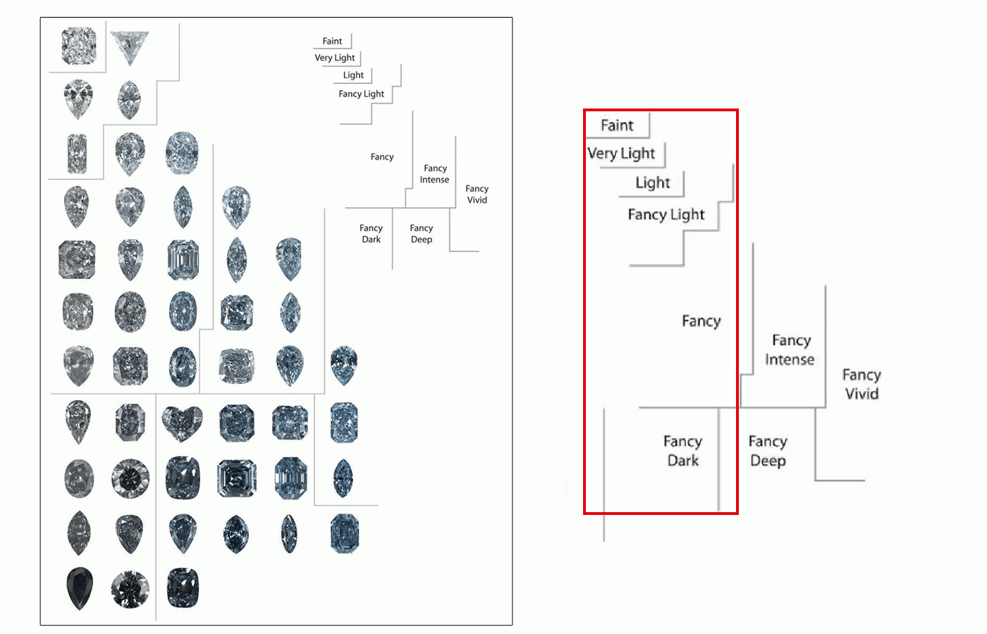 Faint(微蓝色)Very Light(很淡的蓝色)Light(淡蓝色)Fancy Light(淡彩蓝色)Fancy(彩蓝色)Fancy Dark(暗彩蓝色)