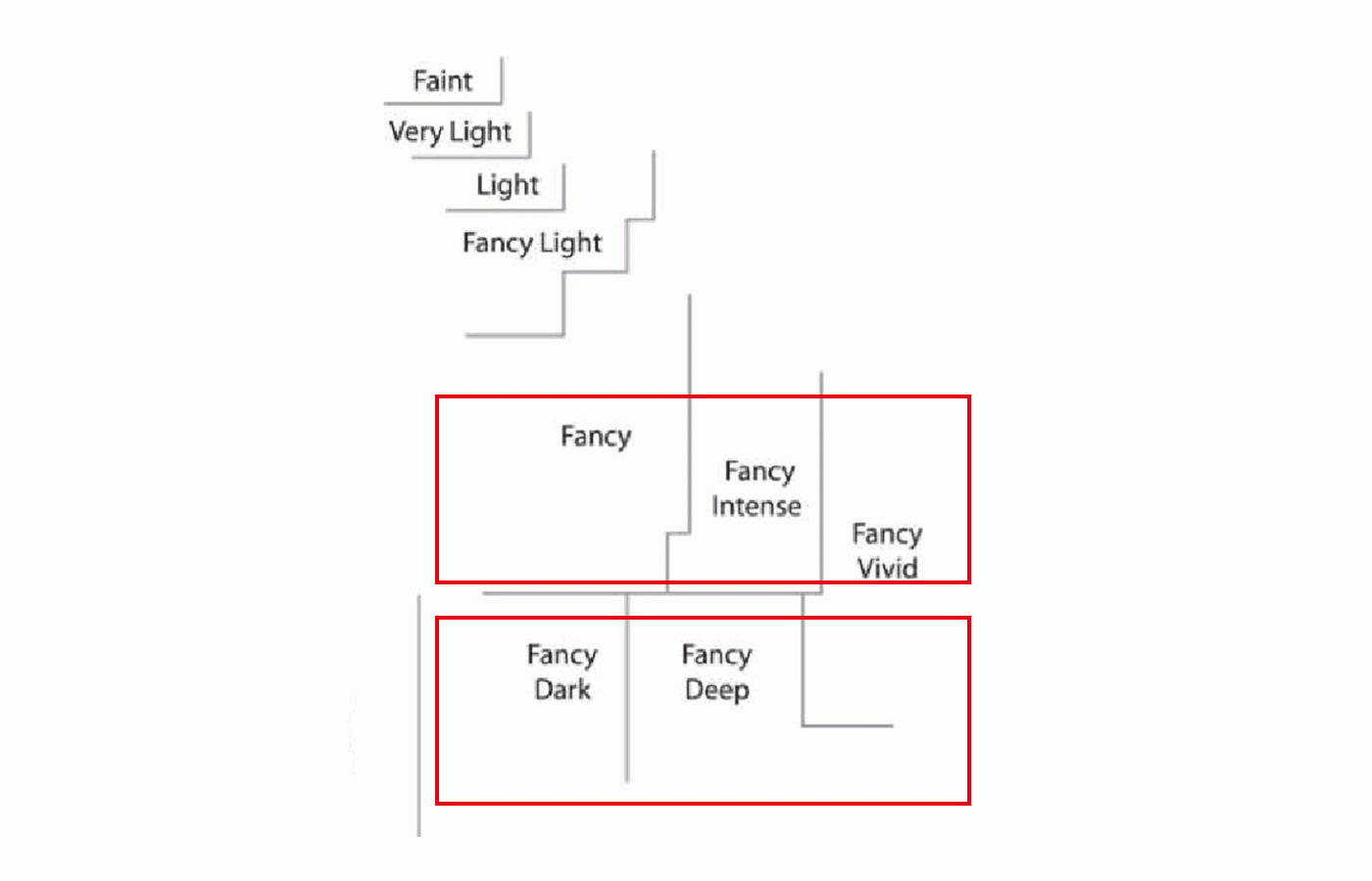 不过有一点也要注意,并不是只一味地追求浓郁,如果颜色过深,彩钻看起来就会发黑,这就是“饱和度”问题。GIA以Fancy(彩级别)开始划分,将饱和度分为两大类,分别为: