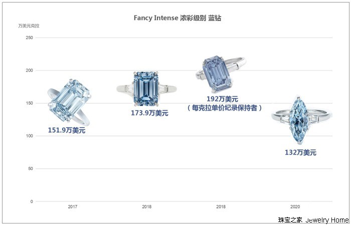 2018年4月于佳士得纽约上拍的3.09克拉Fancy Intense浓彩蓝色钻石,以5,375,000美元成交,每克拉约173.9万美元。