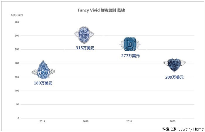 以过往佳士得拍卖过的蓝钻纪录为例,珍稀罕有的高品质珠宝受到市场热烈欢迎和追捧。如2014年佳士得日内瓦上拍的13.22克拉鲜彩The Winston Blue,以2380万美元成交,每克拉约180万美金。