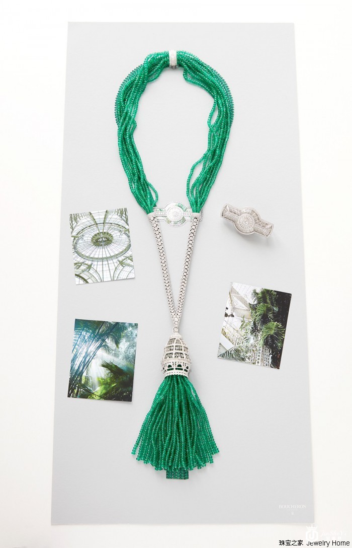 Boucheron 宝诗龙 Paris, vu du 26系列高级珠宝 Verrière玻璃穹顶长项链Jewelry Home:所以事实上,您并没有完全复刻整个建筑的外观,而是选取了他们的一部分?Claire Choisne:是的,再比如这条Verrière玻璃穹顶长项链灵感来自于巴黎大皇宫,我特别喜欢这个建筑中的玻璃穹顶,所以我就选取了这部分制作成了下面的吊坠,而且我们还在里面放置了很多由钛金属制作而成的植物,让它看上去彷佛一个真正的冬景花园。而上面的横条装饰,则是大皇宫俯瞰的样子。同时,它还能被当做胸针来使用。Jewelry Home:您可能也想过宝诗龙并不是第一个以巴黎为灵感设计高级珠宝的品牌,那您为什么还是做了这个决定?Claire Choisne:这是一个很自然的决定,而之所以选择了这个主题,也是和宝诗龙的历史有关的。宝诗龙在巴黎创立,并且在1893年,成为首家在旺多姆广场开店的珠宝商,所以自然而然的,我们就想到了这个主题。虽然也有品牌做过以巴黎建筑为灵感的珠宝,但是我希望能以宝诗龙的视角,来呈现一套不一样的珠宝。