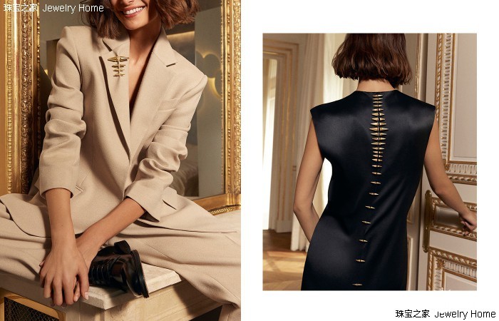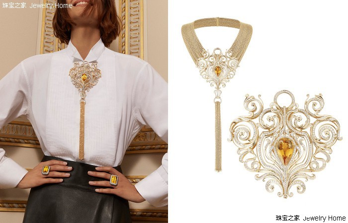 Boucheron 宝诗龙 Paris, vu du 26系列高级珠宝 Armoiries徽章项链Jewelry Home:当提到建筑类型的珠宝,大家可能都会想到巴洛克风格,在您的珠宝中有运用到这种风格吗?Claire Choisne:对的,有用到。在Paris, vu du 26系列高级珠宝的最后一个章节:26V,也就是我们的宝诗龙全球旗舰店。对于宝诗龙来说,这里是我们的家,所以我决定创作这条Armoiries徽章项链。就像欧洲以前很多家族都有一个自己的徽章,其实它也是宝诗龙家族的一个徽章的象征。它的图案灵感来自于来自宝诗龙之家Salon des Fiancés大厅的造型,而这个来自上世纪的巴洛克图案也是因为这次翻修,拆除房间内的现代风格的天花板后才再次展露在大家面前的。同样的,我们赋予了这件珠宝最大的佩戴自由,它有很多种佩戴方式,可以是项链,也可以拆下来当胸针。