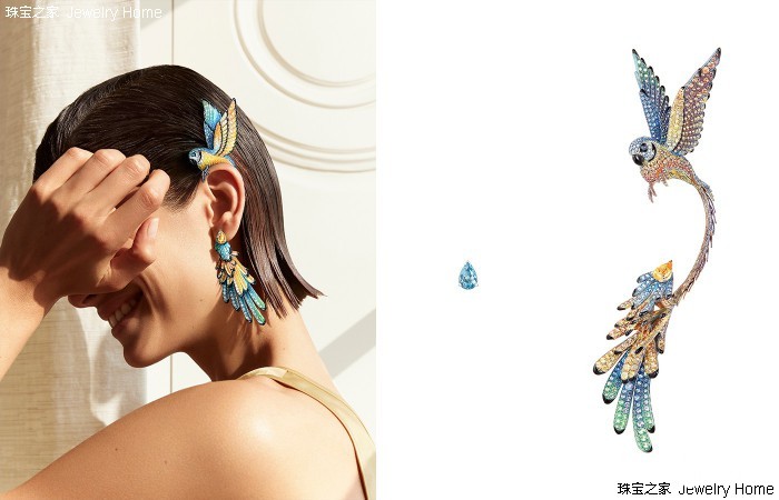 Boucheron 宝诗龙 Paris, vu du 26系列高级珠宝 Nuri鹦鹉耳环 还有,不知道你有没有看到过这件Nuri鹦鹉耳环,它的灵感其实是来自于“宝诗龙之家”一楼的冬景花园,我想象一只鹦鹉在里面展翅飞翔,于是才有了这件珠宝。所以说可能大家的主题相同,但是我们的视角不一样,做出来的东西也不同。